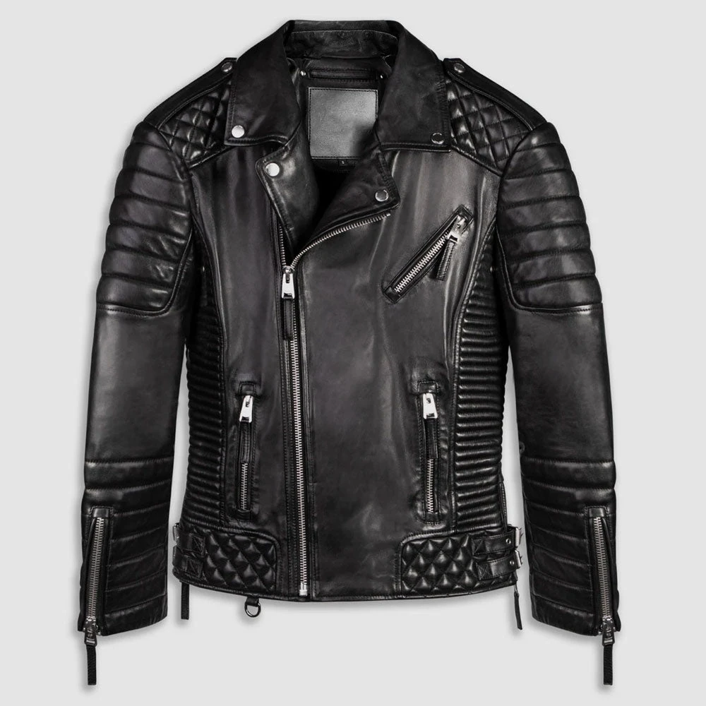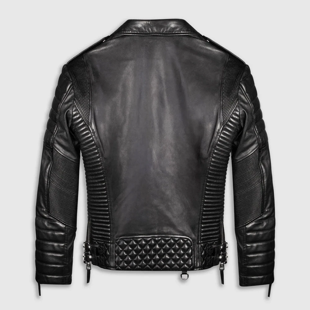 Black Biker Leather Motorcycle Jacket For Men Quilted Style