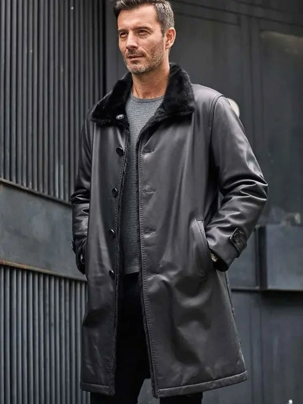 Custom Made Black Fur Leather Parkas Long Trench Coat