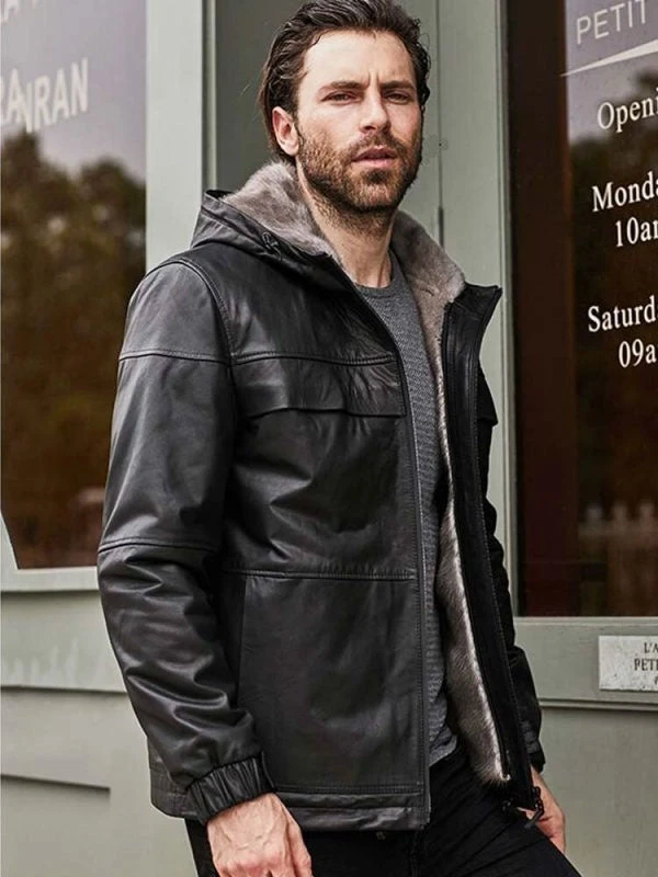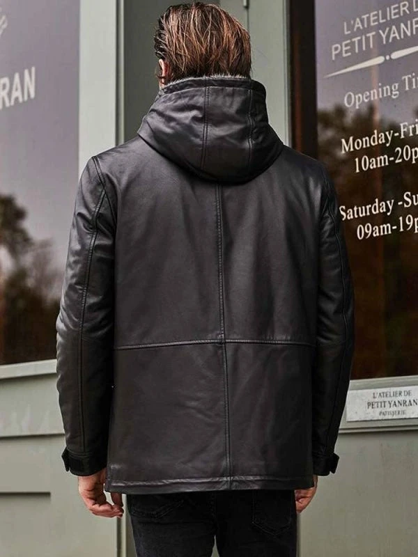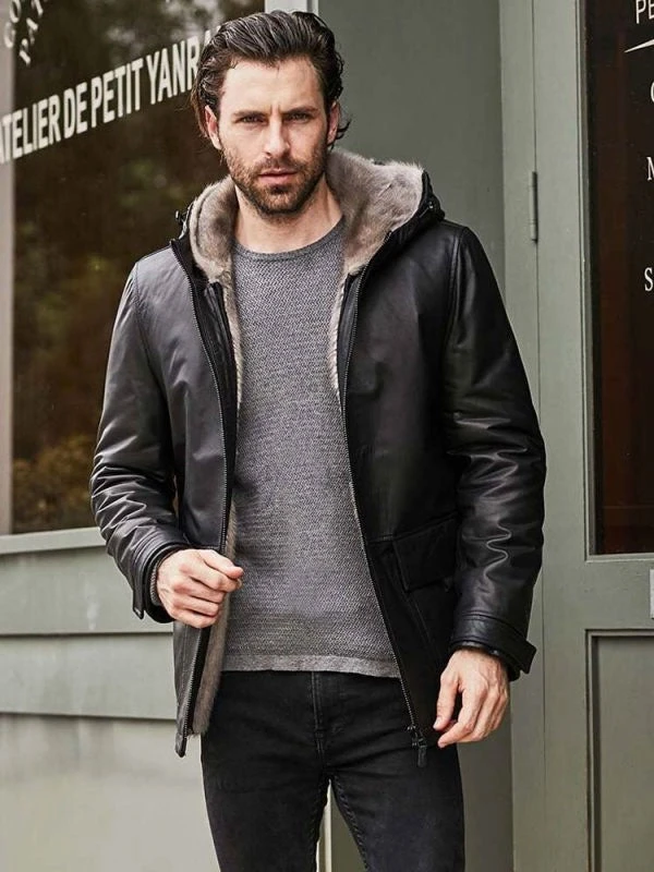 Custom Made Fur Overcoat Black Leather Jacket Hooded Winter Outerwear