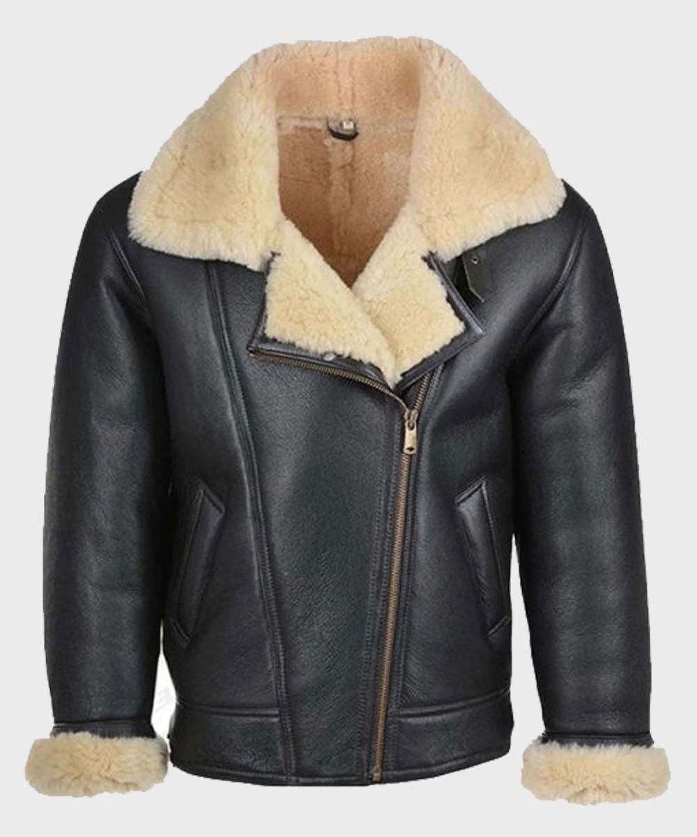The designated Men’s B3 Shearling Black Leather Jacket is a formation of exceptional quality leather material. Likewise, the jacket displays a smooth viscose lining underneath it, and the outer part features a front zip closure with a charming shearling-style collar. Furthermore, it accommodates full-length sleeves, shearling cuffs, and the product is exclusively available in its magnificent Black color.