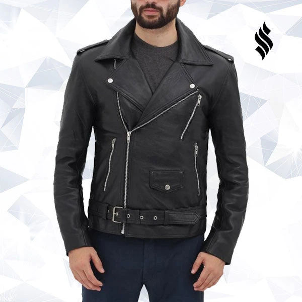 Belted Black Mens Motorcycle Racing Aviator Style Rider Leather Jacket