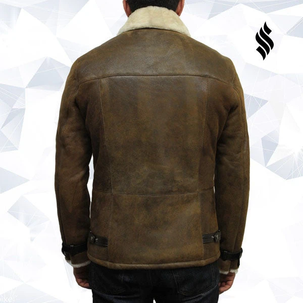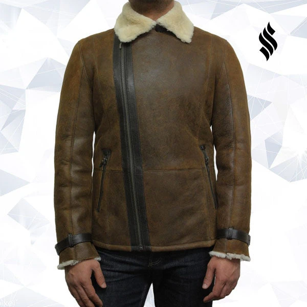 Men’s Luxury Shearling Sheepskin Aviator Rust Brown Leather Flying Jacket Coat