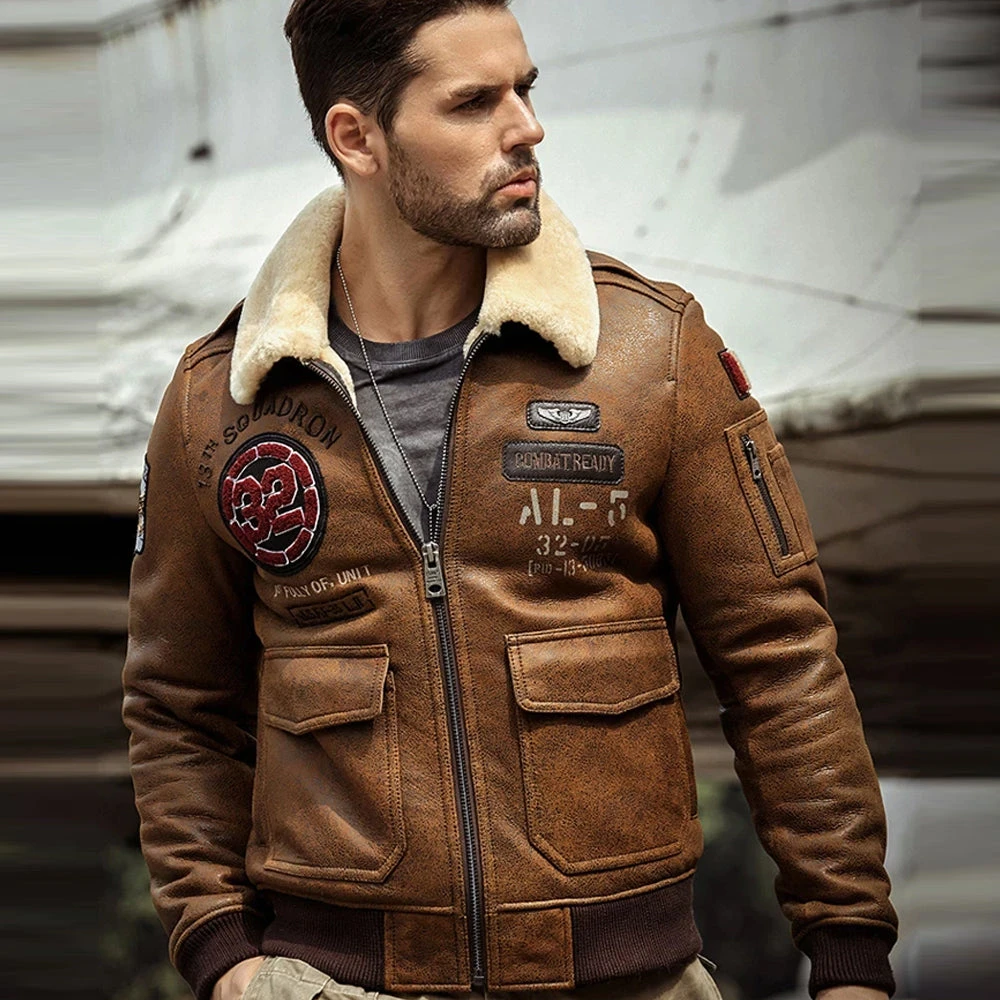Mens B3 Airforce Flight Brown Embroidered Shearling Fur Leather Bomber Jacket Coat