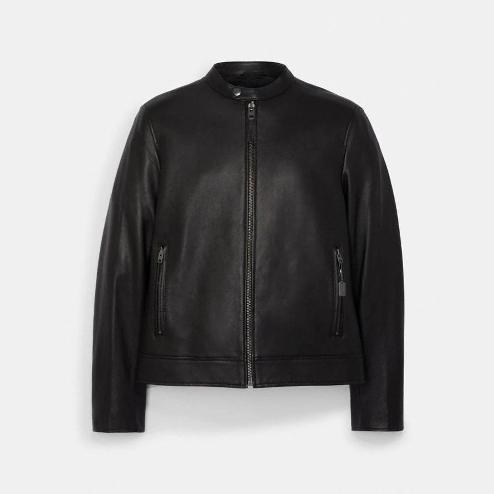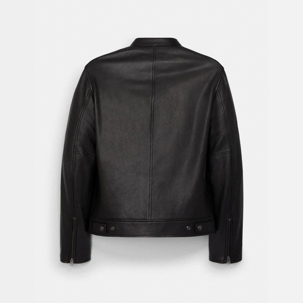 This Black Leather Jacket gives you a cafe racer jacket style and is made of premium quality sheepskin leather. The vertical straight pockets and collar snap makes it unique.