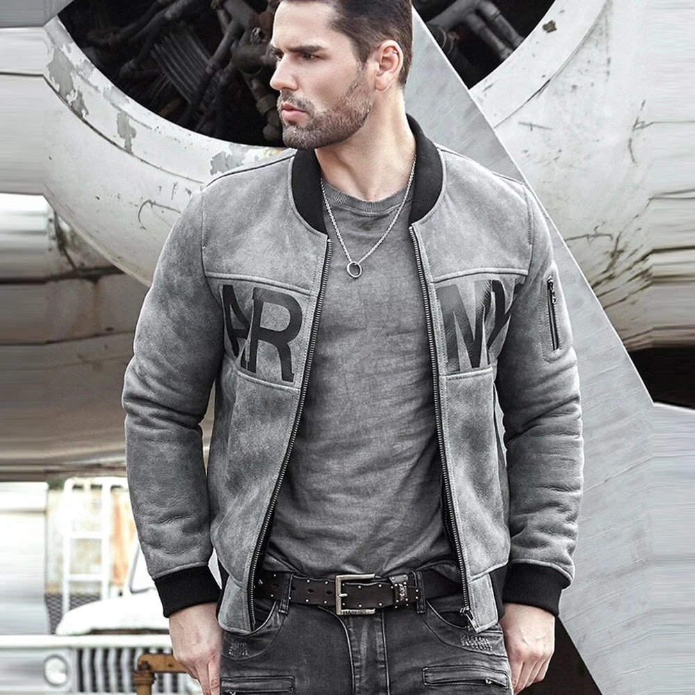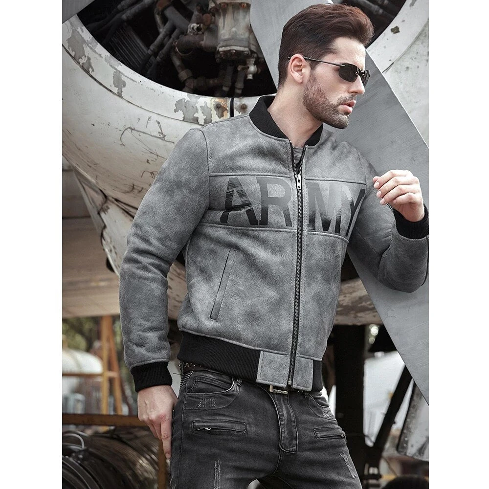 Shearling Leather Mens Grey Sheepskin Army Shearling Bomber Jacket