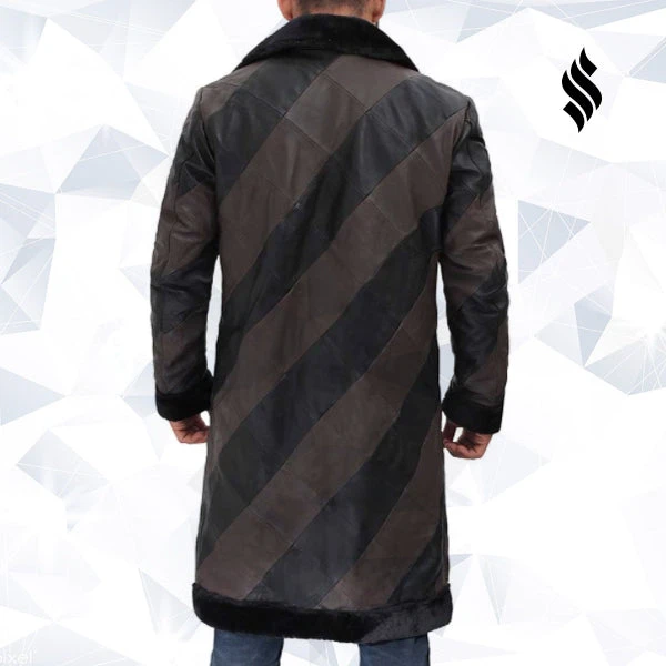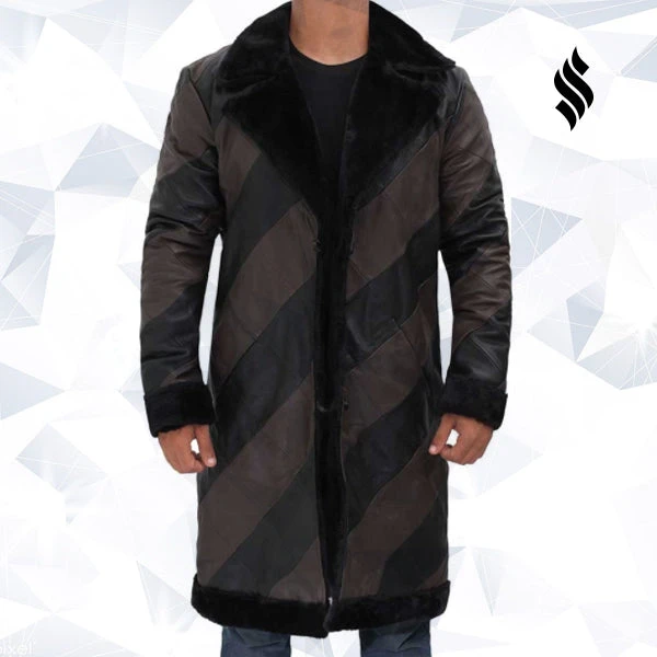 Make your winter style stand out with Shearling Leather’s two-tone real Ralph Two Tone Long Mens Shearling Leather Trench Coat featuring black trimmed lining, button closure, two slanted hand-warming side pockets, and one inside pocket. The black leather trench coat is ideal for your everyday winter look.